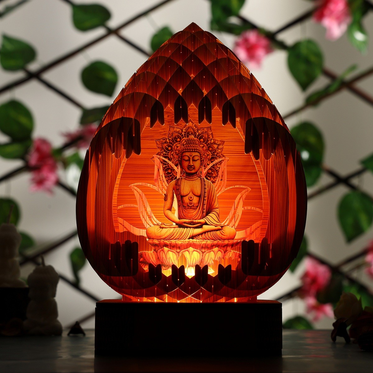 The classic Buddha lamp features a centered Buddha silhouette surrounded by a soft LED halo. Handcrafted with layered wood and a finely sanded finish, it emits a warm, peaceful glow. Perfect for nightstands, meditation corners, or altar spaces, it brings calm wherever it’s placed.