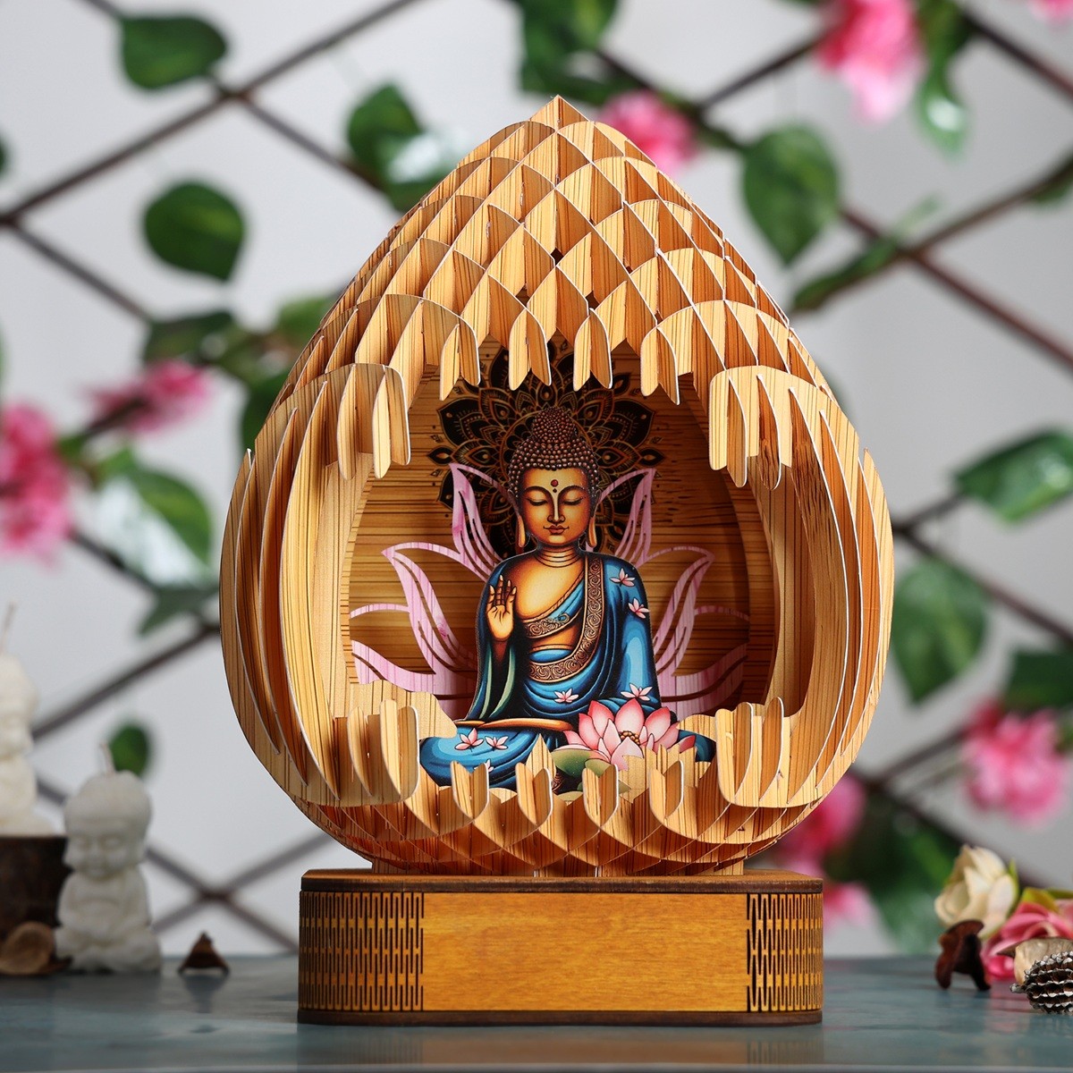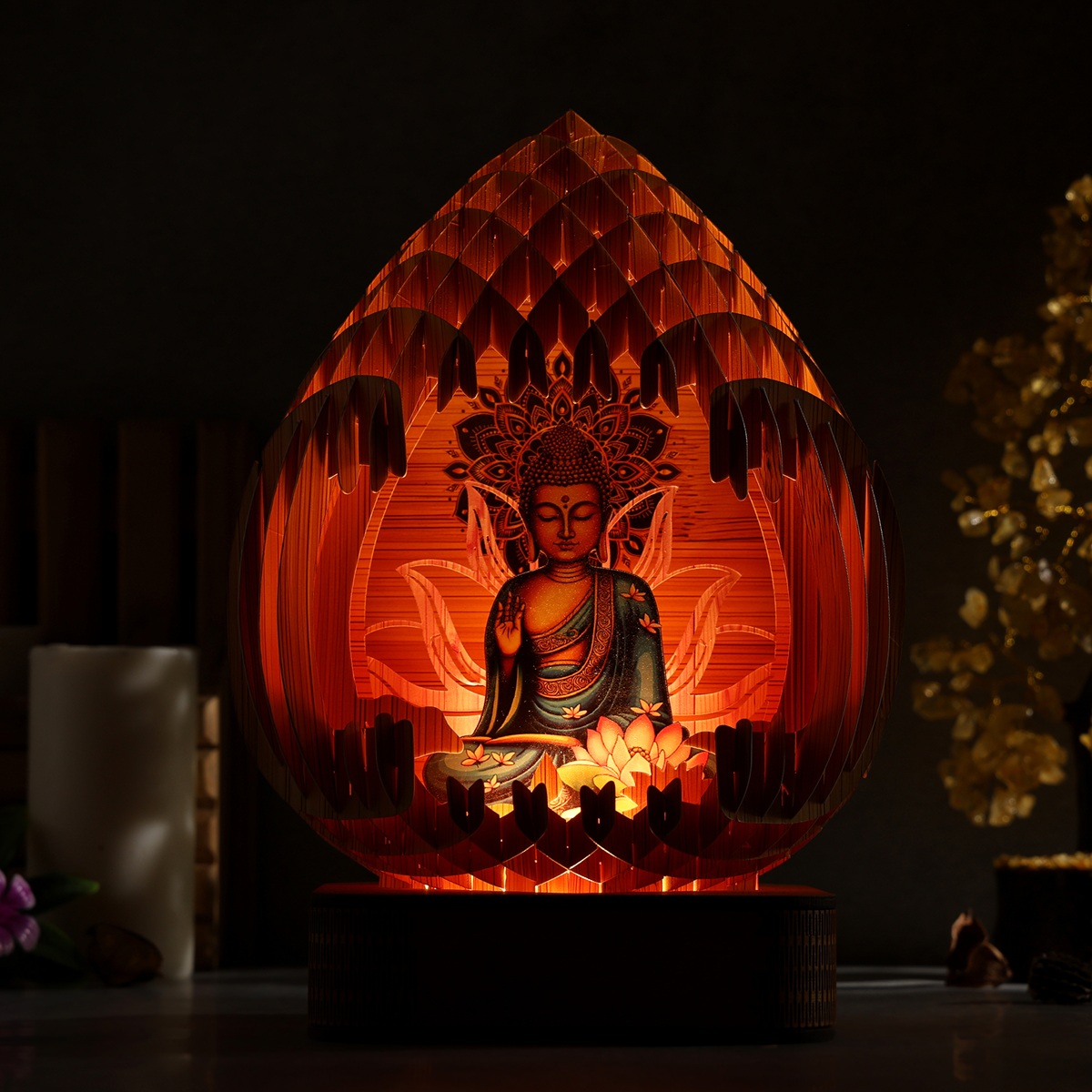 The buddha lamp minimalism, with a circular LED ring placed behind the Buddha silhouette to mimic a meditative aura. Its sleek, modern styling works in both spiritual and contemporary settings.