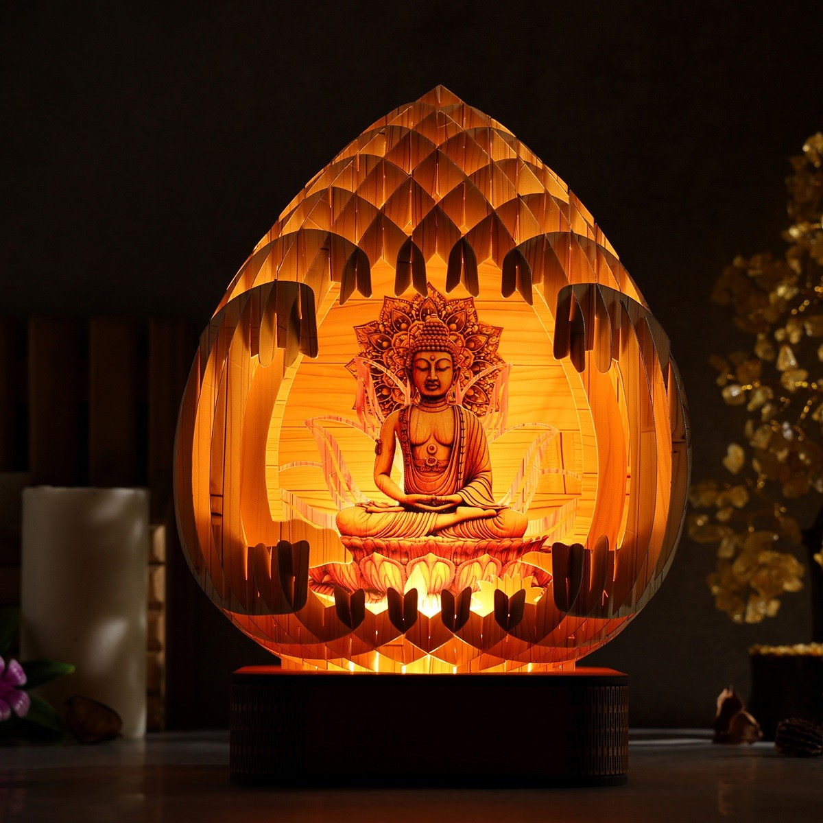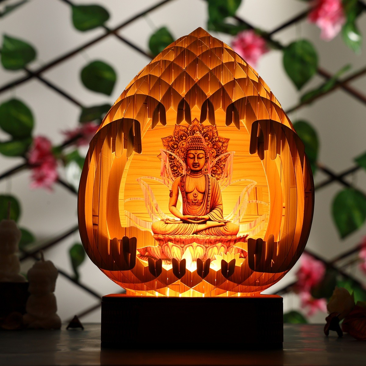 This features a serene Buddha silhouette enclosed within radiant rays that fan outward like the sun. Crafted with precision-layered wood, the LED backlight enhances its divine presence—making it a centerpiece in any spiritual or living space.