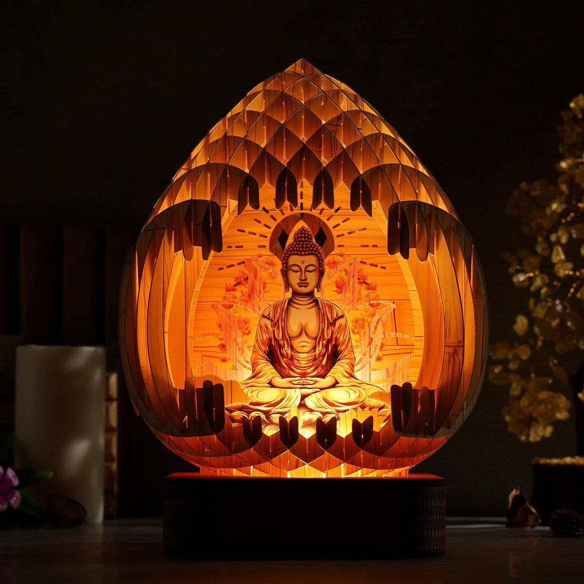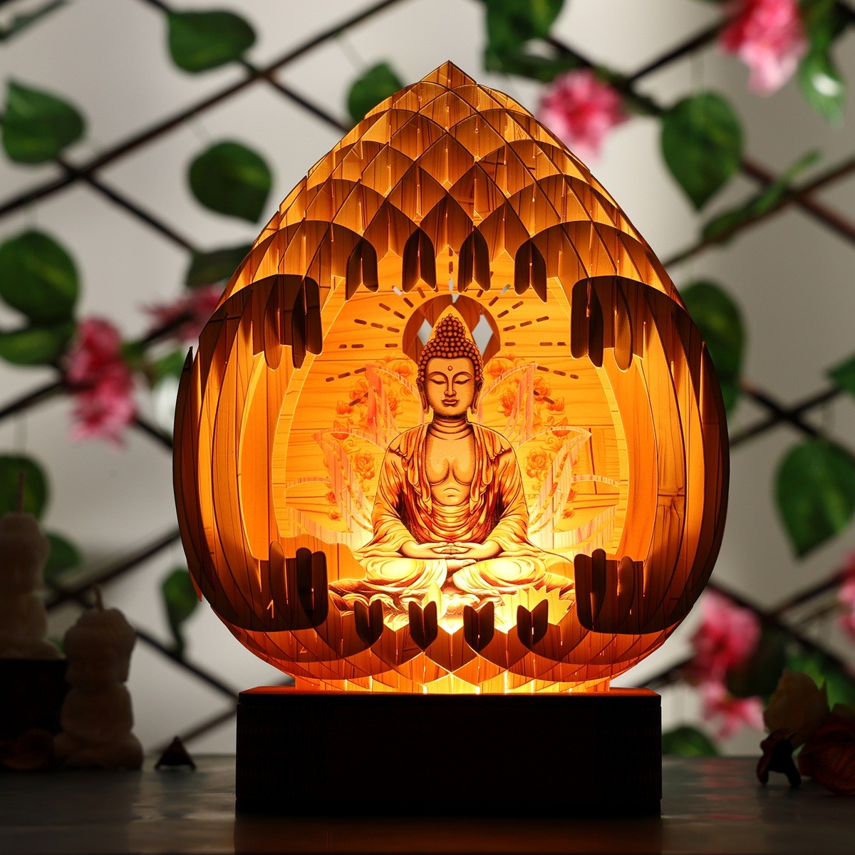 This design captures the Buddha in a gentle namaste pose, carved with intricate detail and soft curves. The warm LED glow brings depth to its folded hands and smiling face, offering instant calm.
