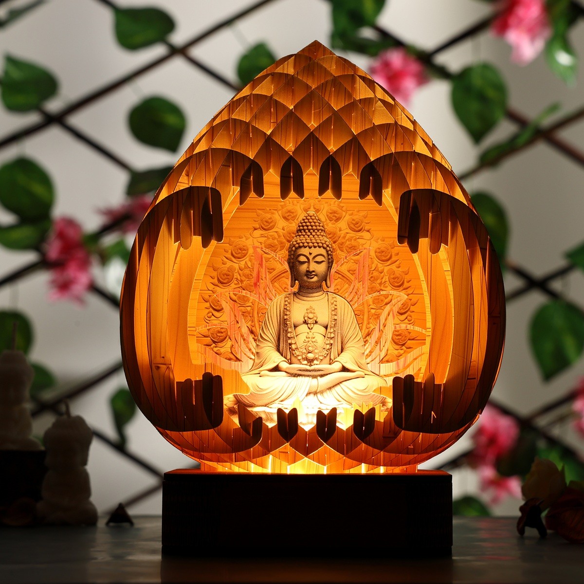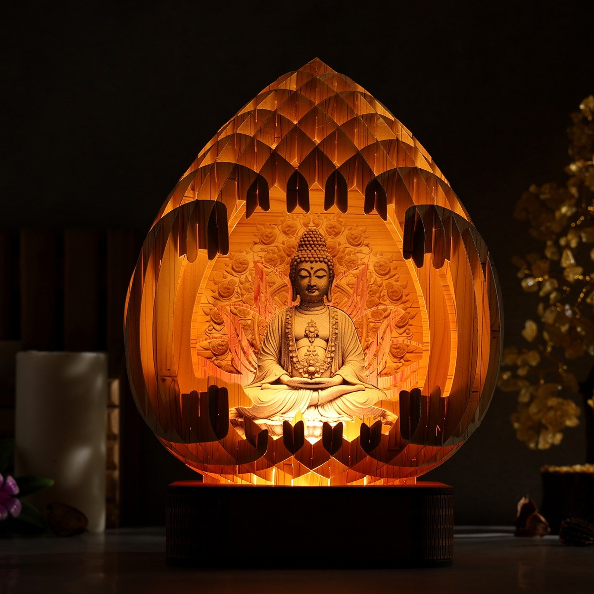 A modern interpretation of divine light, this lamp has layered arcs behind the Buddha figure to resemble chakras or energy fields. The multi-tone lighting option enhances its meditative appeal.