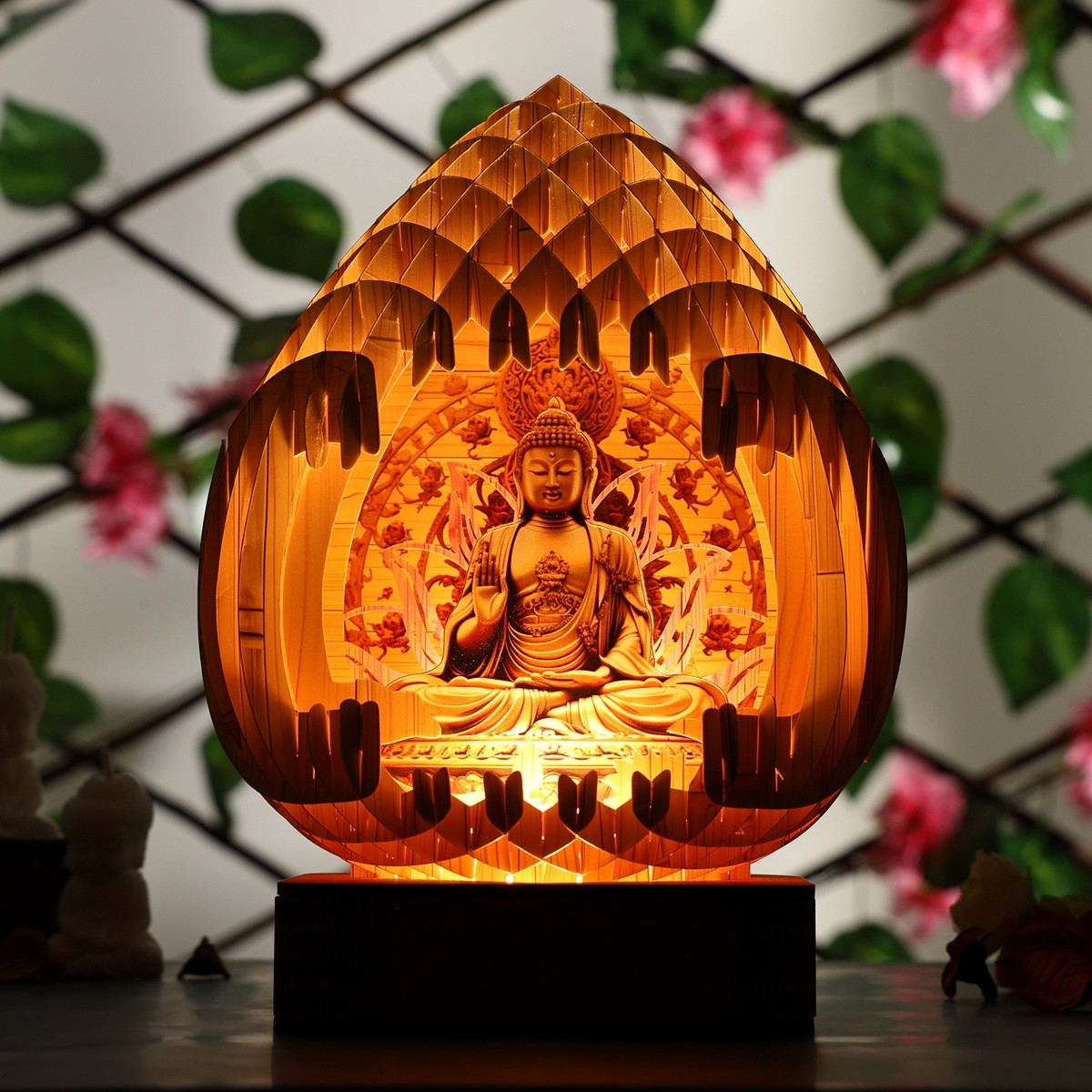 This stunning design places the Buddha in a meditative flame-shaped frame rising from a carved lotus base. The flame represents purity and truth, while the lotus grounds the spiritual meaning.