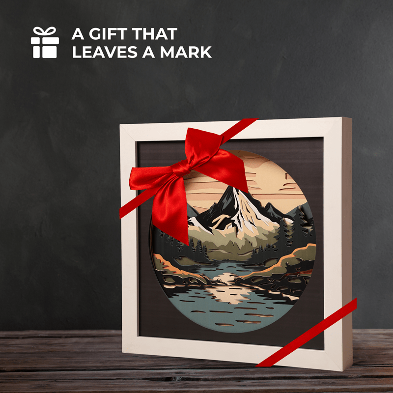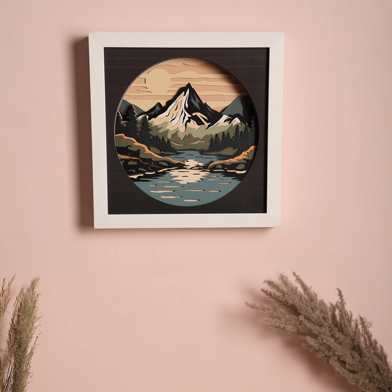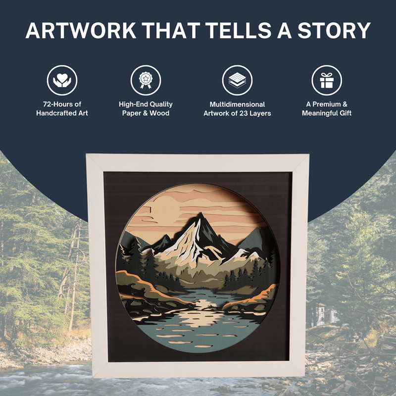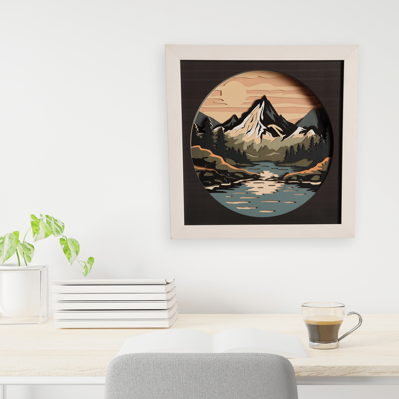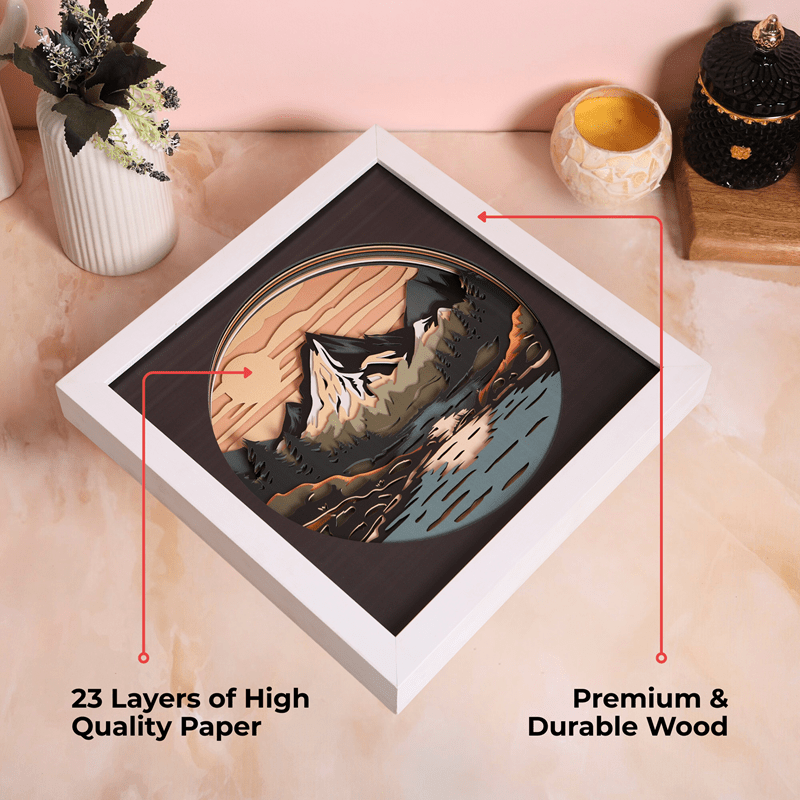 Escape into nature’s serenity with Tranquil Peaks, a multilayer wooden wall art capturing a majestic mountain range under a glowing sky. Crafted with 12 precision-cut layers, this scenic piece combines forest greens, snow-capped whites, and twilight oranges to create depth and mood.