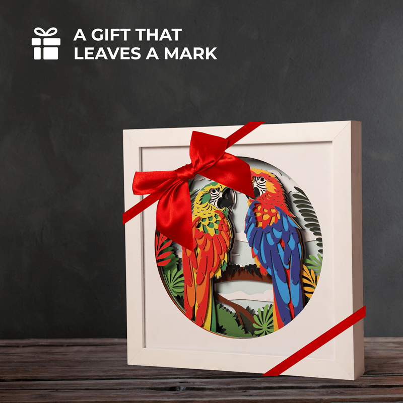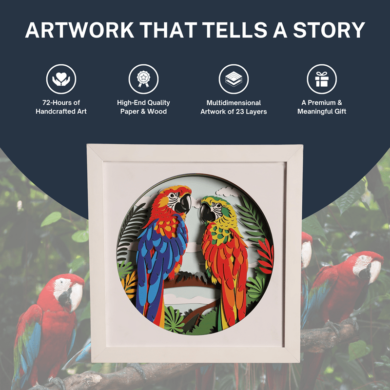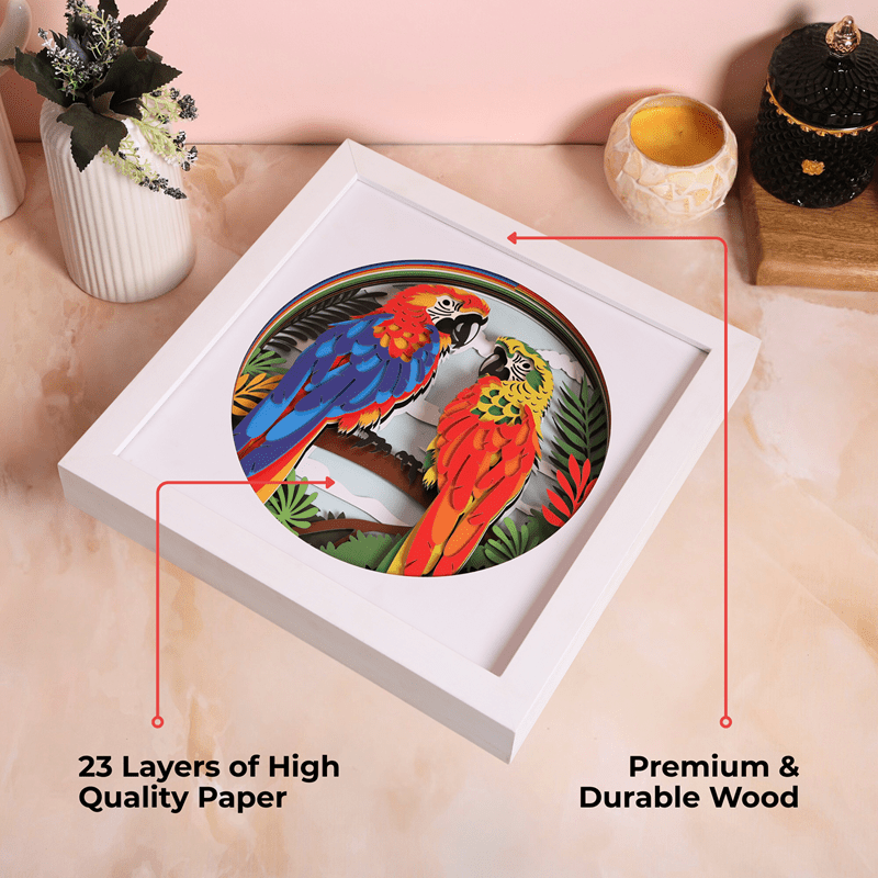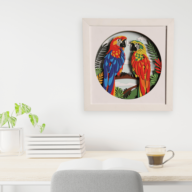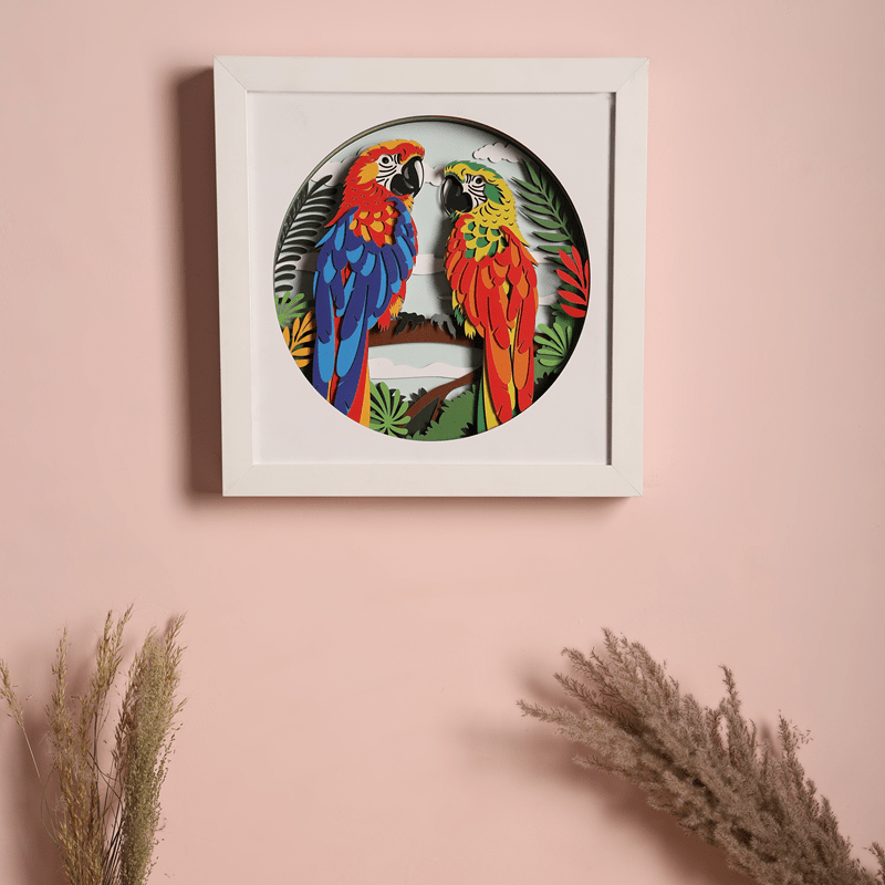 Liven up your space with the bold, exotic beauty of Tropical Parrot Duo. This multilayer wood art showcases a pair of vibrantly feathered parrots perched against a lush rainforest backdrop, bringing the warmth of the tropics right into your home.
